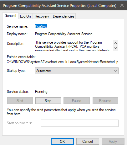 Find "Program Compatibility Assistant Service", right-click on it and click on "Properties". Set the "Startup Type" to "Automatic". Click "Apply" and then click "Start".
