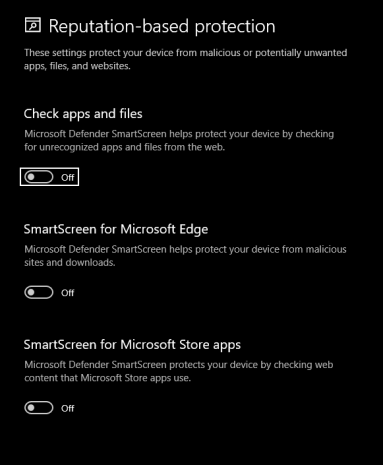 Turn off "Check apps and files", "SmartScreen for Edge", and "SmartScreen for Microsoft Store Apps".